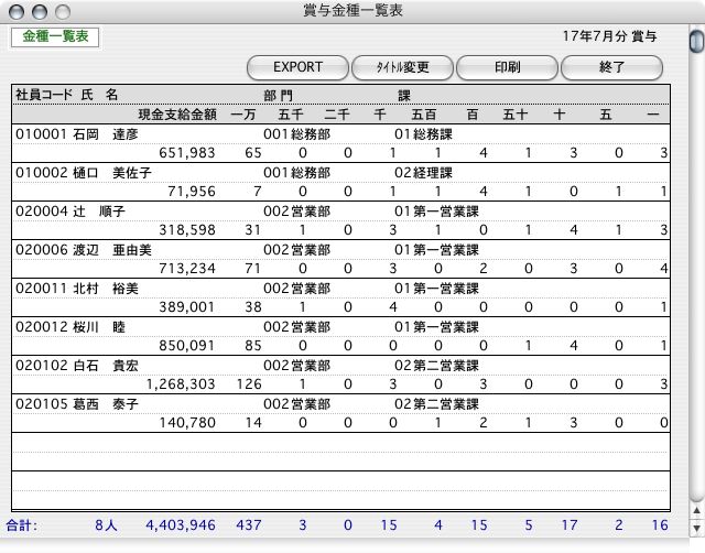 3.「賞与金種一覧表」が画面に表示されます。