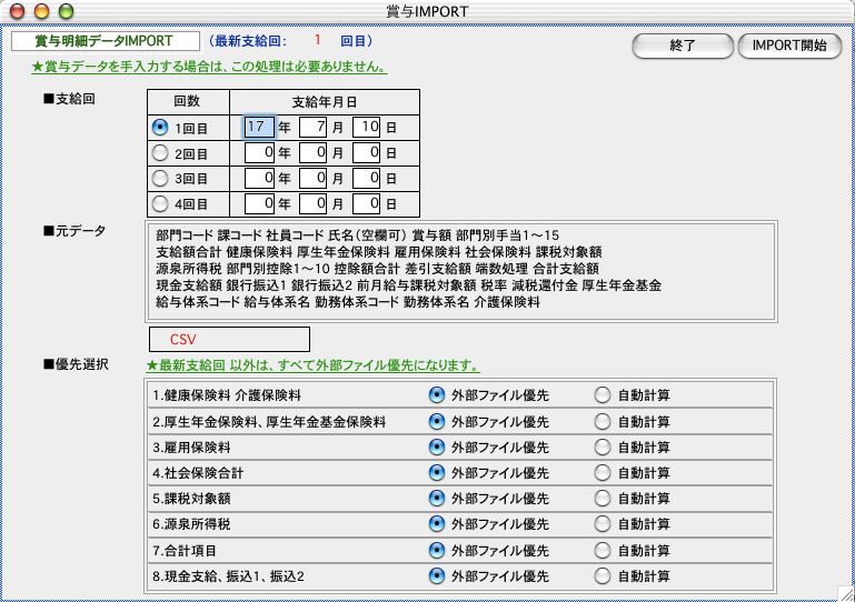 それぞれの項目について、「外部ファイル優先」と「社員情報から適用」のどちらか、または、 「外部ファイル優先」と「自動計算」のどちらか、を選択します。