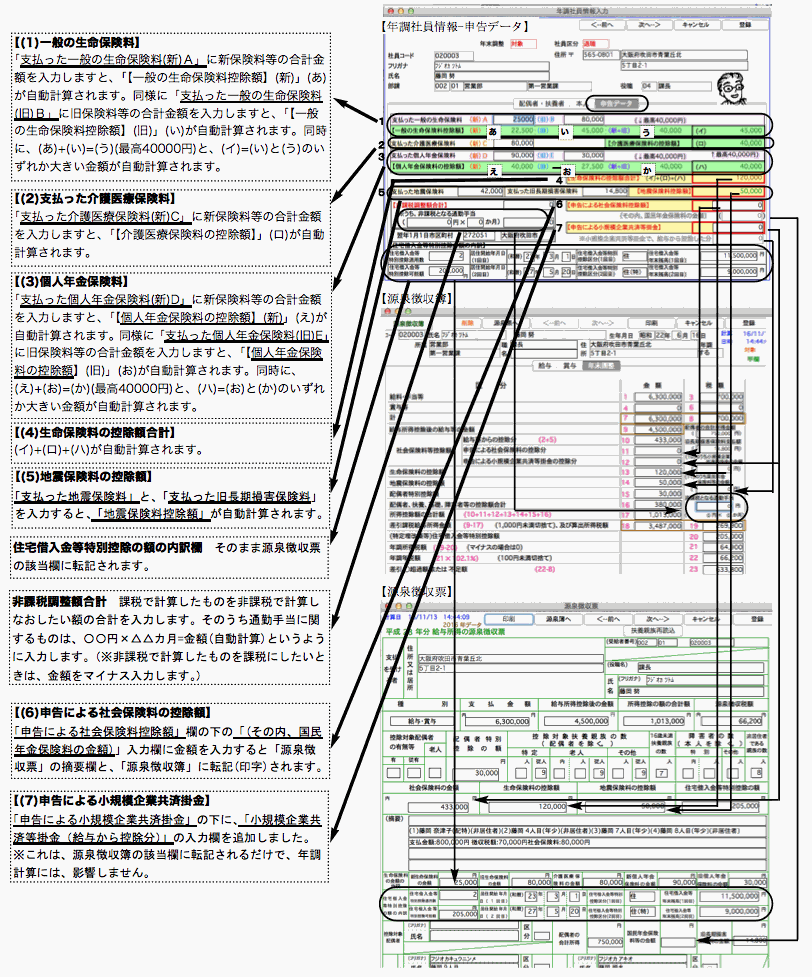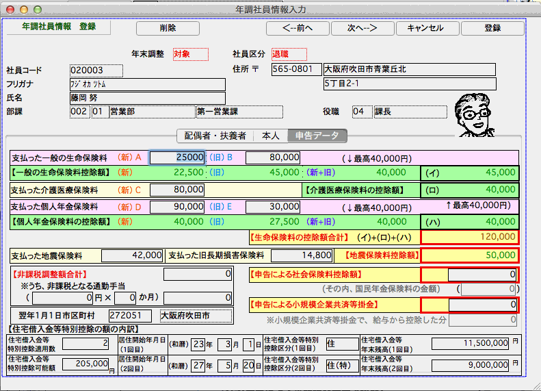 社員の配偶者や扶養者、本人に関する情報や、支払った生命保険料等の申告データを入力します。