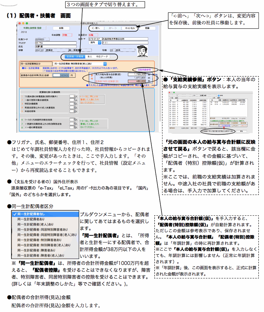 「 2.年調社員情報検索」の手順で、社員一覧を表示させます。社員一覧からダブルクリックして「年調社員情報入力」画面を表示させます。画面は、「配偶者・扶養者」「本人」「申告データ」の3つあり、それぞれのタブで切り替えます。