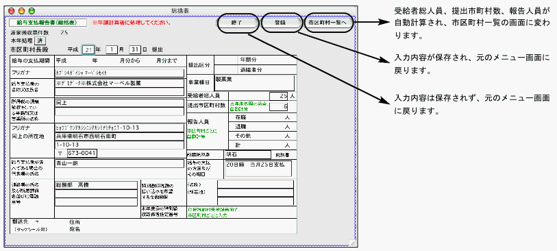市区町村に総括票を郵送する時の宛名シールの印刷ができます。住所は、「住民税納付先登録画面」か、総括票提出市区町村一覧からダブルクリックした「総括票」の画面で入力します。使用するタックシールは、ヒサゴOP(GP)861に対応しています。