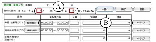 5.人員、支給額、税額は、自動集計された後、手修正もできます。日雇労務者の賃金(06)と、退職手当等(07)、税理士等の報酬(08)については、自動集計はされませんので、すべて手入力してください。各行の、支払年月日〜税額をすべてクリアしたい時は、該当行の「クリア」ボタンをクリックしてください。
