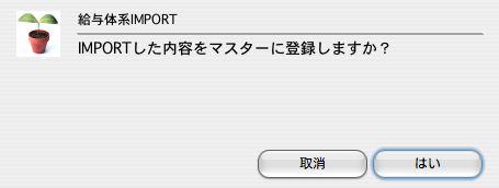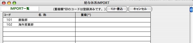 ※既に登録済のものと、給与体系コードが重複していると、重複欄に「*」マークが表示されます。この場合、「キャンセル」ボタンでいったん戻った後、元のデータの給与体系コードを変更後、再度IMPORTを行ってください。