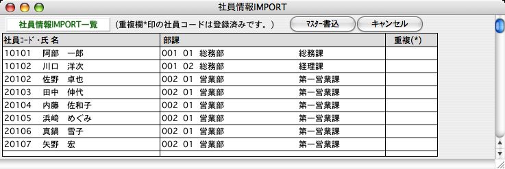 ※既に登録済のものと、社員コードが重複していると、重複欄に「*」マークが表示されます。この場合、「キャンセル」ボタンでいったん戻った後、元のデータの 社員コードを変更後、再度IMPORTを行ってください。また、部課コードが未登録の場合は、重複欄に「?」マークが表示されます。「キャンセル」ボタンでいったん戻り、元データの部課コードを変更するか、給与ソフト側で登録したあと、再度IMPORT処理を行ってください。
