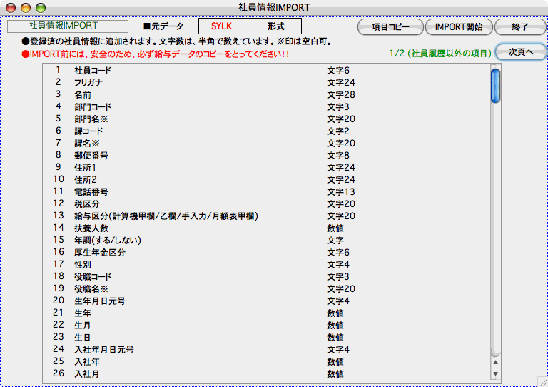 2.社員情報IMPORTの項目一覧が表示されます。
