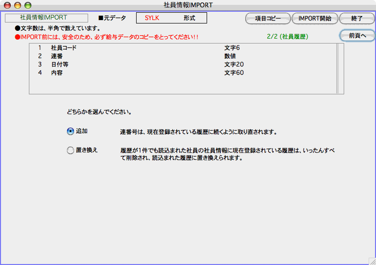 社員情報の項目や、元データのファイル形式を確認して、「IMPORT開始」ボタンをクリックします。