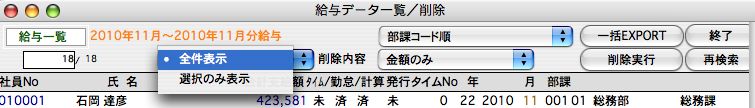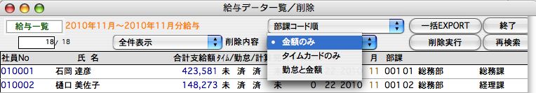 「給与データ一覧・削除」の機能を使って検索したデータは、「一括EXPORT」(複数月、複数年にまたがったデータのEXPORT)することができます。この形式のデータは、「給与データ一覧削除」メニューの「一括IMPORT」で読み込むことができます。