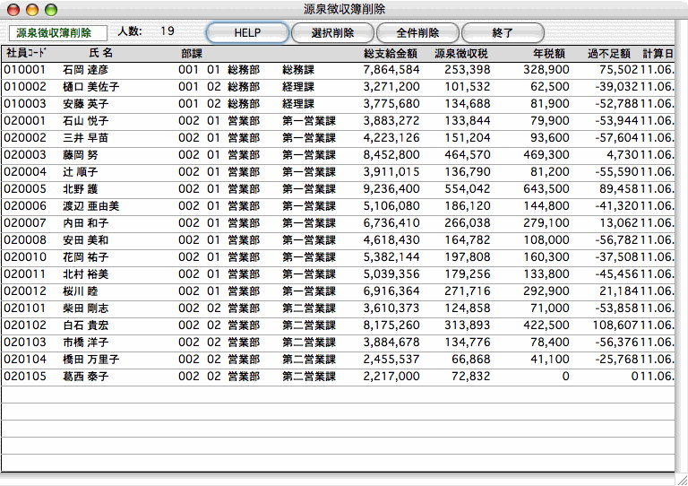 「全件削除」:表示中の全件の源泉徴収簿データを削除します。