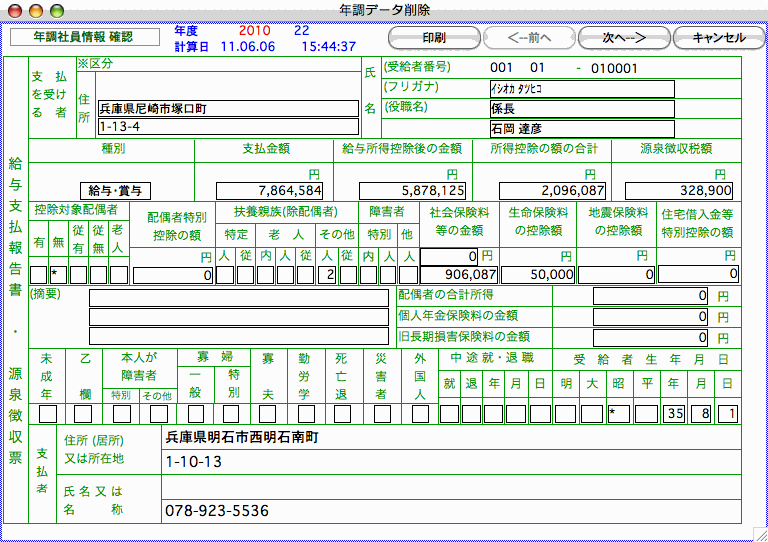年調計算後、入力ミスなどに気がついて、訂正した場合、いったん「源泉徴収簿削除」を行い、再度、「年末調整計算」を行うことにより、再度、源泉徴収簿データが作成されます。