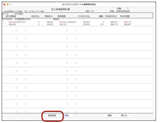 「仕入先残高再計算」ボタンをクリックし、締日選択の上、残高再計算を行ってください。