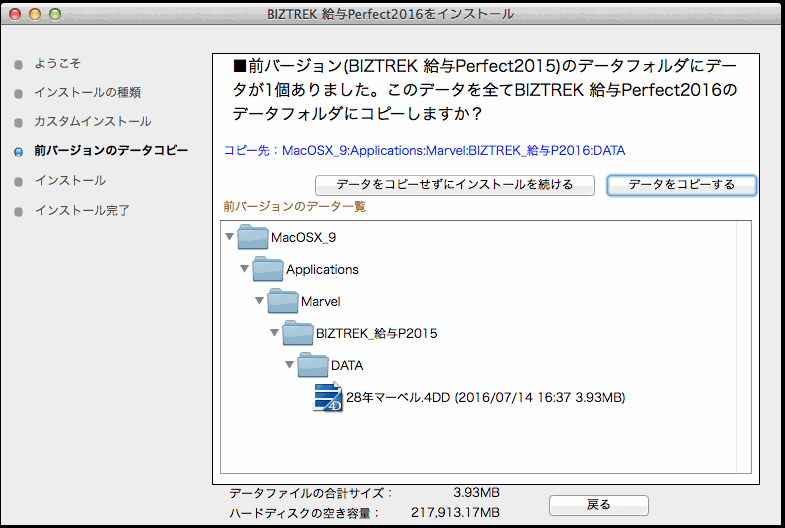 (Mac版) 「ハードディスク」→「アプリケーション」→「Marvel」→「BIZTREK給与P(S)2015」→「DATA」フォルダの中に保存されていれば、v2015の給与データを、今回インストールして作成される v2016の「DATAフォルダへ自動的にコピーする事ができます。この場合、次のような画面が表示されます。
