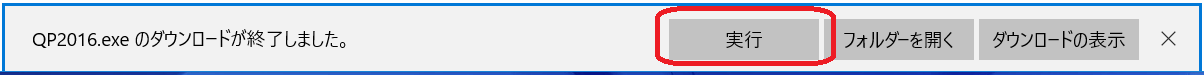 2.しばらくして、ダウンロード用圧縮ファイル(「QP2016exe」)のダウンロードが終わると、下図ウィンドウが表示されますので「実行」をクリックします。