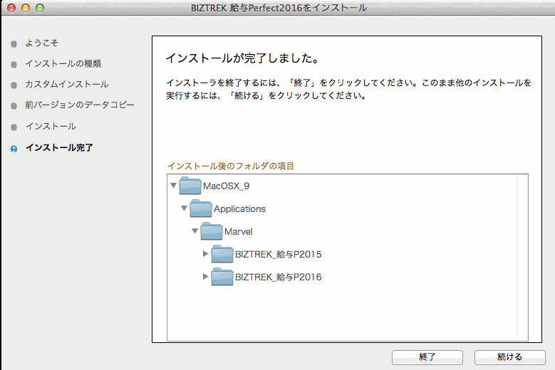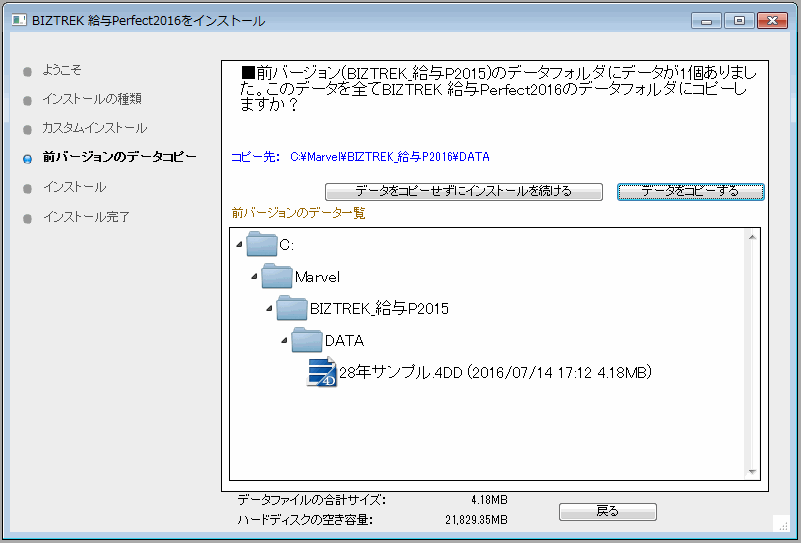 (Windows版) 「ローカルディスクC」→「Marvel」→「BIZTREK給与P(S)2015」→「DATA」フォルダの中に保存されていれば、v2015給与データを、今回インストールして作成される v2016の「DATA」フォルダへ自動的にコピーする事ができます。この場合、次のような画面が表示されます。