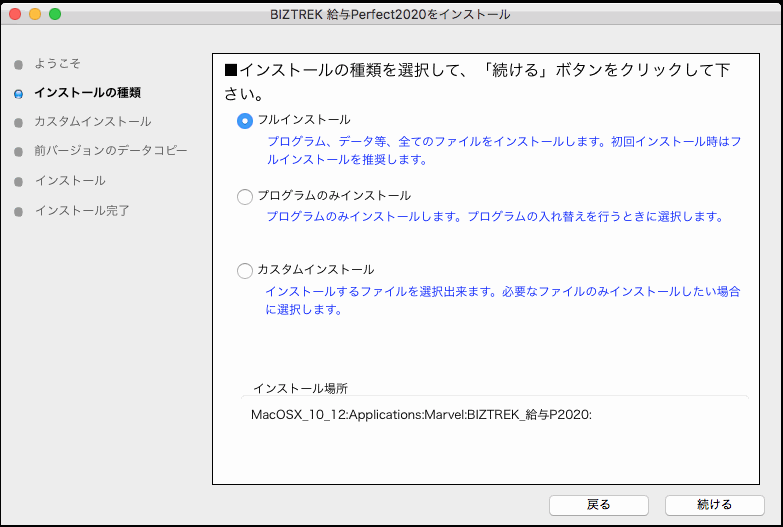 5.インストールの種類を選択する画面で、 v2020のプログラム入替をするときは「○プログラムのみインストール」を、初めてv2020をインストールする場合は「○フルインストール」を選択し、「続ける」ボタンをクリックします。