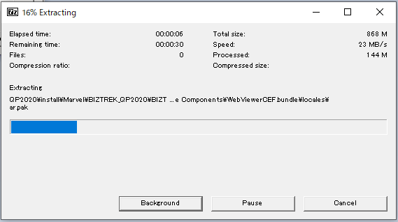 数秒後、圧縮ファイル解凍の進捗状況を示す下図のウィンドウが表示され、解凍が完了すると、このウィンドウは自動的に閉じます
