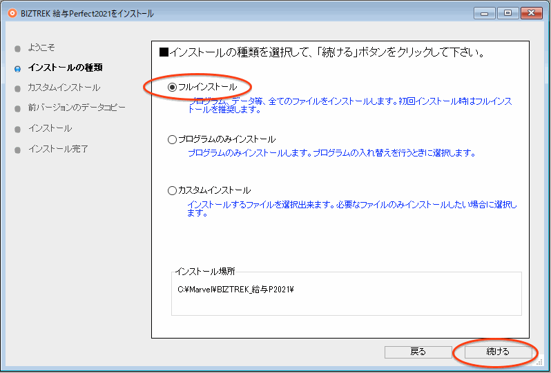 8. インストールの種類を選択する画面で、 v2021のプログラム入替をするときは「○プログラムのみインストール」を、初めてv2021をインストールする場合は「●フルインストール」を選択し、「続ける」ボタンをクリックします。