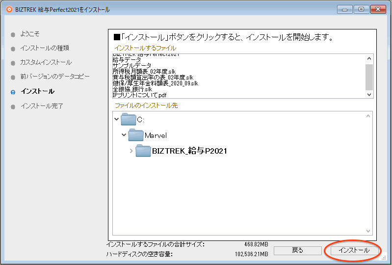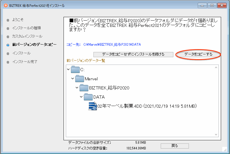 (Windows版) 「ローカルディスクC」→「Marvel」→「BIZTREK給与P(S)2020」→「DATA」フォルダの中に保存されていれば、v2020給与データを、今回インストールして作成される v2021の「DATA」フォルダへ自動的にコピーする事ができます。この場合、次のような画面が表示されます。