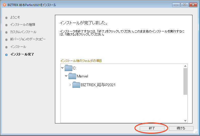 8.●Windows版:「ローカルディスクC」→「Marvel」フォルダ→「BIZTREK_給与P(S)2021」フォルダ→「BIZTREK_QP(QS)2021 」フォルダが新しく作成されているはずです。