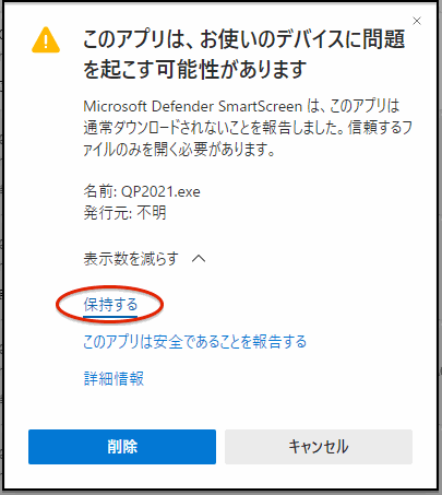 ダウンロードが始まり、ウィンドウの左下部分に、「QP2021.exe」と、残り時間(分、秒)が表示されます。