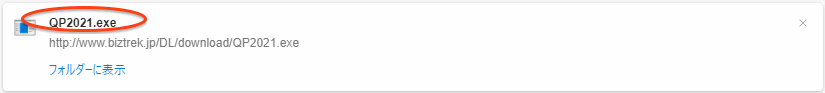 残り時間の表示がなくなったら、ダウンロード完了ですので、「QP2021.exe」の部分をクリックします。