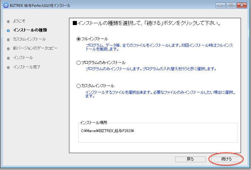 8 インストールの種類を選択する画面で、 v2023のプログラム入替をするときは「○プログラムのみインストール」を、初めてv2023をインストールする場合は「●フルインストール」を選択し、「続ける」ボタンをクリックします。