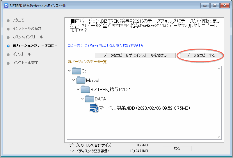 (Windows版) 「ローカルディスクC」→「Marvel」→「BIZTREK給与P(S)2021」→「DATA」フォルダの中に保存されていれば、v2021給与データを、今回インストールして作成される v2023の「DATA」フォルダへ自動的にコピーする事ができます。この場合、次のような画面が表示されます。