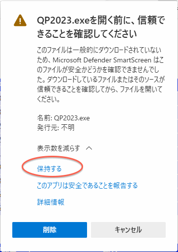 ダウンロードが始まり、ウィンドウの左下部分に、「QP2023.exe」と、残り時間(分、秒)が表示されます。
