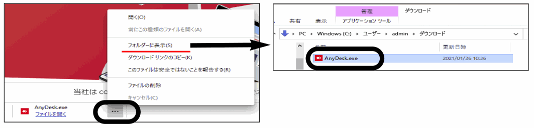 右の「…」部分をクリックし、「フォルダーに 表示」を選択すると、ダウンロードされた「AnyDesk.exe」が表示されます。