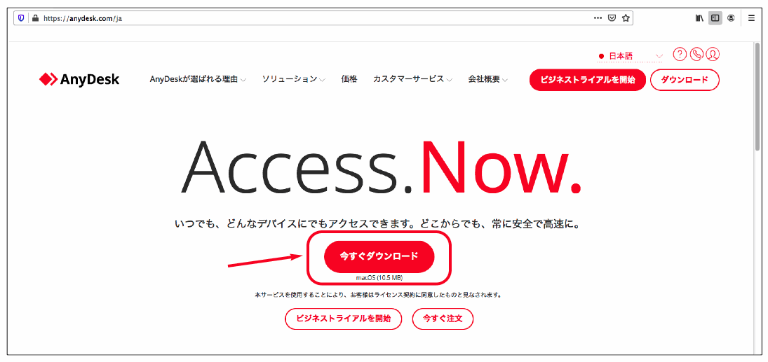 『今すぐ無償でダウンロード』をクリック⇒「AnyDeskをダウンロードしていただきありがとうございます。....」の表示画面され、ダウンロードが始まります。