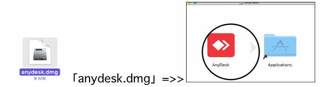 ダブルクリックすると、「AnyDesk」アイコンが表示されますので、アイコンを「アプリケーションフォルダ」にコピー後Dock等へ保存していただくと、