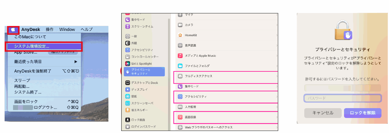 (2)システム環境設定を開きます。 =>> 「セキュリティー&プライバシー」=>> 各「フルディスクアクセス」「アクセシビリティ」