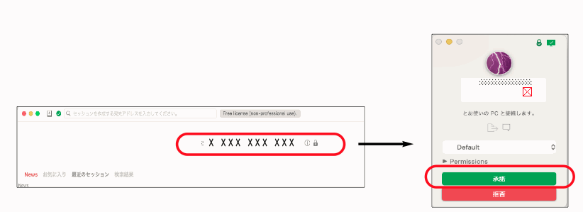 画面左上の9桁の番号をサポート担当者へ伝えます。接続の確認画面を表示しますので、