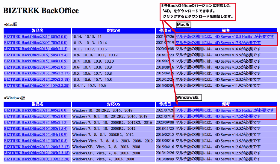 ※マルチ版をご利用の場合、ダウンロードするBackOfficeプログラムの使用バージョンに合った、「4D」のダウンロードも上記のサイトから行なえます。