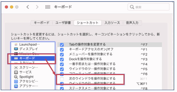1. Macの「システム環境設定」 =>「キーボード」 =>「ショートカット」タブをクリック