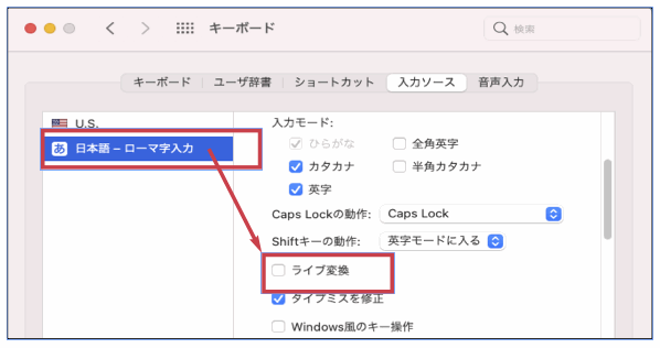3.右一覧の「ライブ変換」のチェックボックをオフにします。