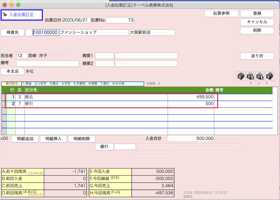 (例)請求額 500,000円の振込が得意先より振込手数料500円が差し引かれた499,500円で入金された為、差額分(振込手数料分)を値引きとして処理したい場合。