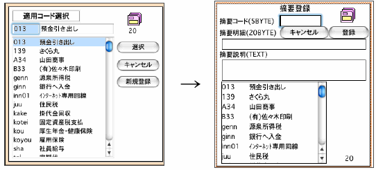 [摘要コード選択画面]→新規登録ボタンで 、 [摘要登録画面]を表示します。(コード、明細入力→登録)