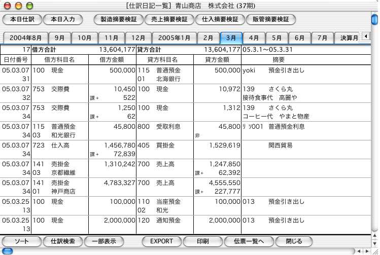 例えば「1月」のボタンで1月の仕訳を表示した後、そのまま「2月」のボタンを押せば、2月の仕訳を表示しますので、仕訳のチェックが簡単にできます。