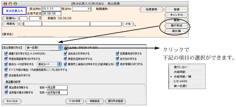 受注伝票入力→「発行形式」設定→「登録」ボタンをクリック→発行(印刷)