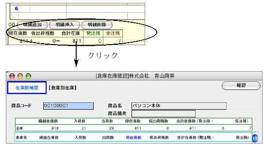 ●商品コードを入力した際、仕入伝票左下の在庫数が表示され、確認できます。また、在庫数が表示されている画面をクリックすると、、詳しい在庫状況が確認できます。