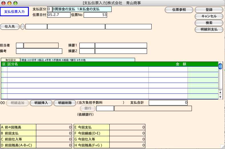 ●支払伝票の入力を行います。支払伝票には、『買掛金の支払』と『未払金の支払』の区分があります。『検索』ボタンからは、支払伝票一覧・訂正・削除等を行うことができます。