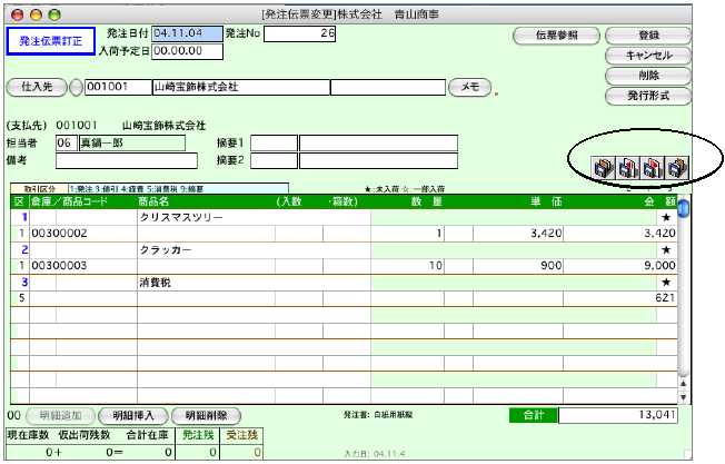 ●左端から、先頭の伝票・1枚前の伝票・1枚後の伝票・最後の伝票に移動します。これらのボタンは変更内容を登録せず、伝票の移動を行います。