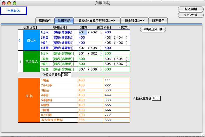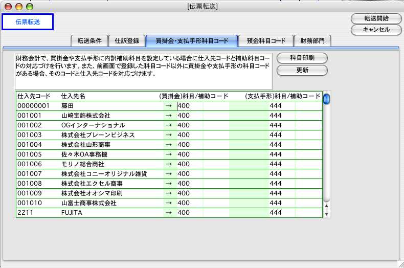 ●伝票転送画面の1項目目の「買掛金内訳科目別転記有」の欄にチェックすると、伝票転送画面の3項目目で 指定した仕入先-補助科目対応表に従い、買掛金の補助科目コードが書き込まれます。チェックをはずすと、買掛金の補助科目は空欄になります。この場合の買掛金コードは3項目目で指定したコードが使用されます。(この場合3項目目の設定内容は、関係ありません)「支払手形の補助科目別転記有」「預金の補助科目別転記有」についても同様です。