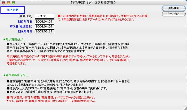 年次更新処理を、急いでする必要はありません。 年次更新処理をしなくても、次年度のデータは入力できますので、過去の売上実績などを見たい場合、年次更新処理の操作をする必要はありません。(データの容量が大きくなりすぎる場合、2002年に、2000年までの年次更新をするというのも、一つの使用方法です)前年度のデータで下記の処理が終了していない場合、年次更新処理は実行しないでください。翌年になって、最初の請求処理・締日更新が全締日(全仕入先と全得意先)について終わってから、前年度の年次更新を行なってください。
