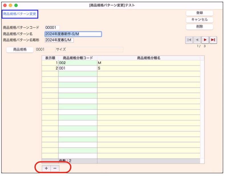 明細の左下にある「+」ボタンをクリックします。 カーソルが一番上部の明細の「商品規格分類コード」へ移動します。