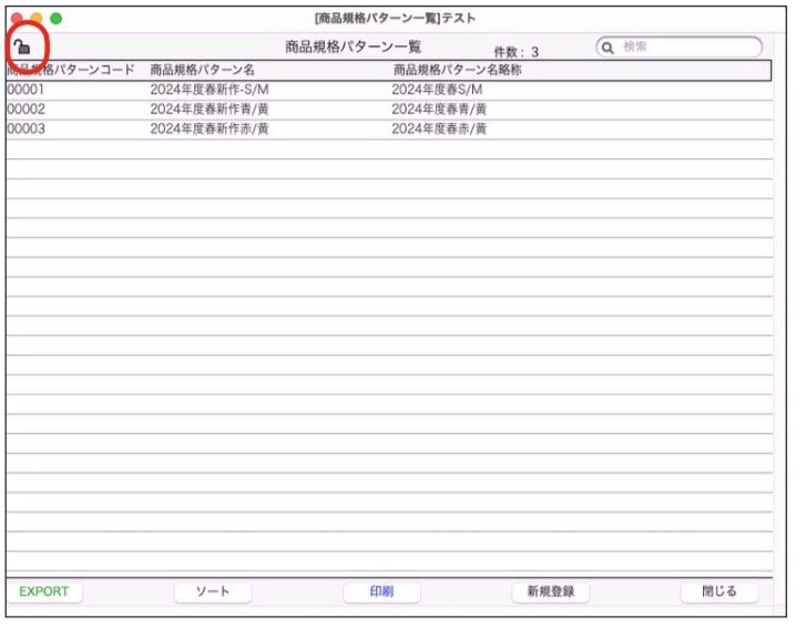 登録済みの商品規格パターンマスタを修正する場合は、商品規格パターン一覧画面の 左上鍵マーク をクリックし、 解除します。