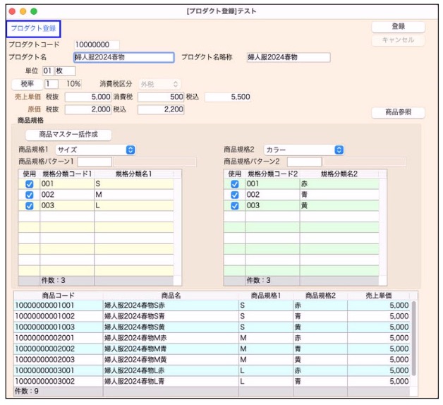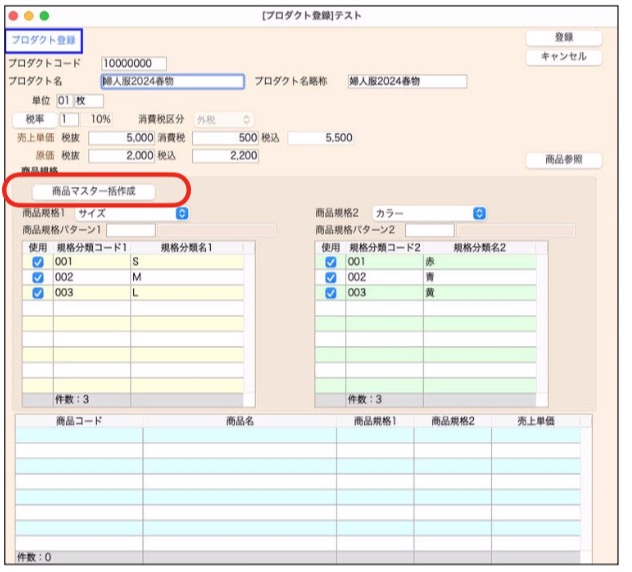 「商品マスタ一括作成」 ボタンは、商品規格を設定し、複数の商品規格パターンのマスタを一括で作成する事ができます。