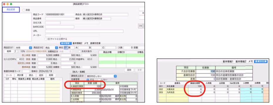 「A.繰越在庫数」(全体在庫)と、「倉庫別在庫」ボタンをクリックし、倉庫別の「繰越在庫数」と全体在庫の繰越在庫数と一致するように在庫数を入力してください。
