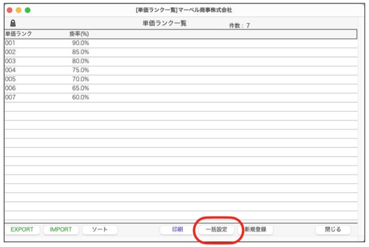 単価ランクの設定を「掛率」を使用して商品マスタへ一括設定したい場合、「単価ランク」マスタから一括登録が行えます。