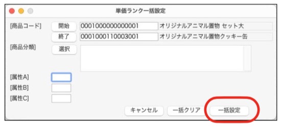 2.単価ランクを一括設定する対象商品を、商品コードや商品分類コードで範囲指定し「一括設定」ボタンをクリックします。